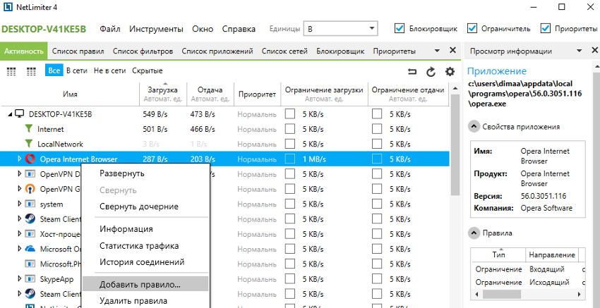 Например, установив сортировку имеющихся процессов и программ по значению «Загрузка», можно увидеть, какие именно ресурсы используют соединение с интернет-сетью. После этого в меню «Нетлимитера» выбирается опция «Добавить правило» и скорость корректируется.