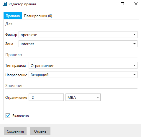 Допустим, требуется создать правило «Ограничение на входящий трафик». Тогда надо указать лимиты в Кб/сек. или Мб/сек.