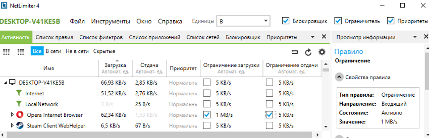 Редактируя трафик, следует выбирать зону — LocalNetwork или Internet, иначе лимиты будут установлены к обеим зонам. За счёт этой функции можно управлять скоростью потоков не только на одном ПК, но и на нескольких, подключённых к единой сети.
